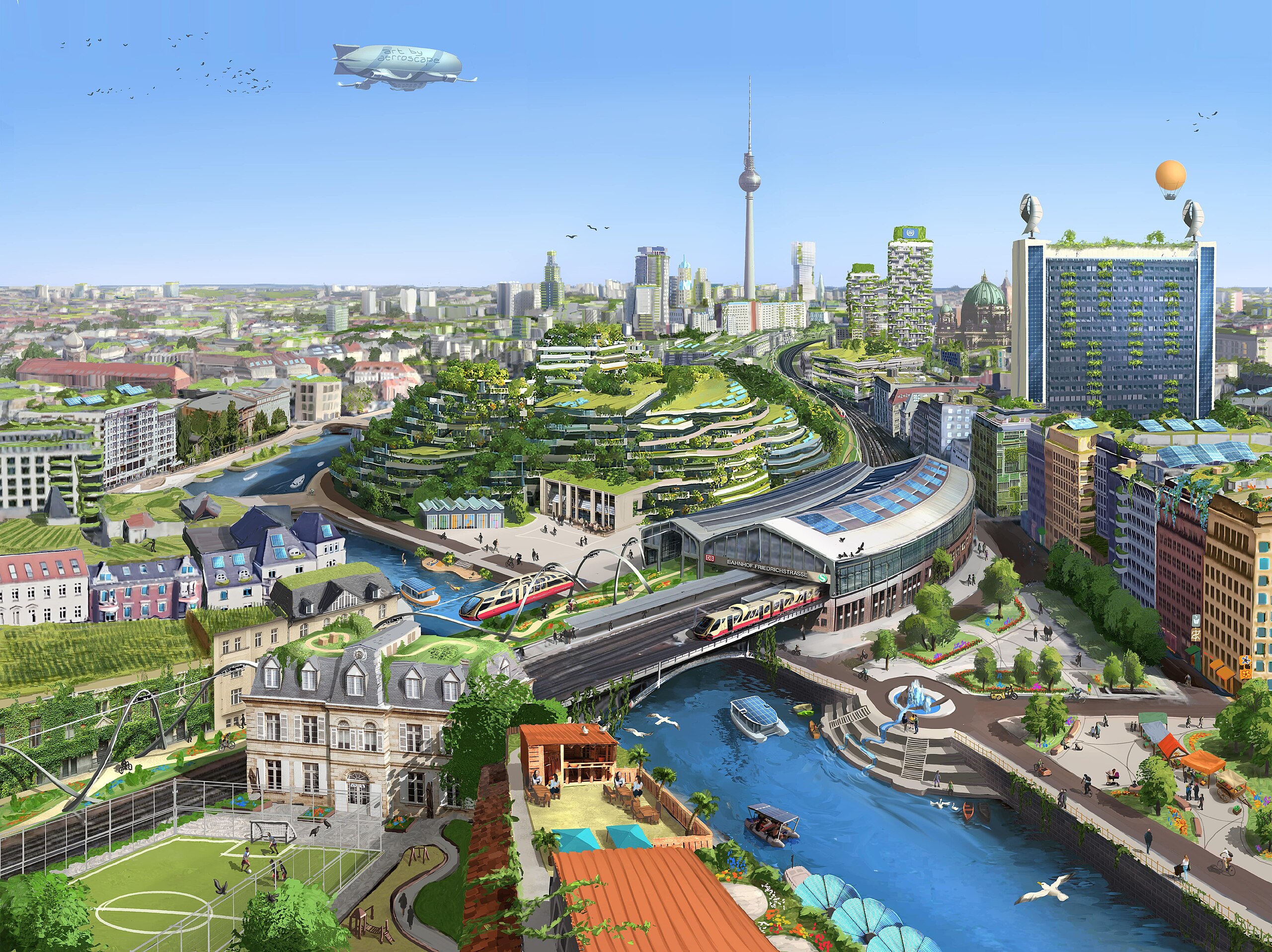 English: An aerial view of a futuristic, sustainable Berlin - with lots of solar power, trees and greenery, airships, walkable streets, clean water... |